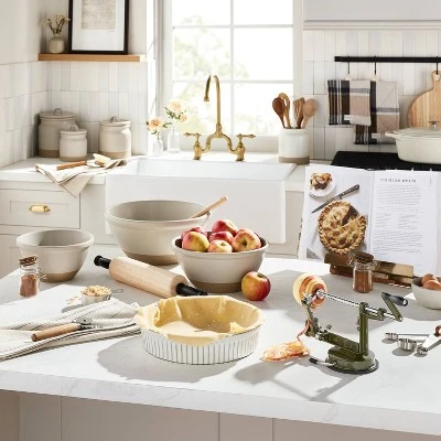 Start preparing your favorite pie with the 10.5-Inch Fluted Stoneware Pie Dish from Hearth & Hand™ with Magnolia. This cream-colored pie dish is designed in a round shape and features a fluted exterior for an elegant look. Made with stoneware, this round pie dish helps provide even heating and is oven safe up to 500 degrees. You can use it to reheat in the microwave or store pie in the freezer, and the dishwasher-safe construction allows easy cleaning.
