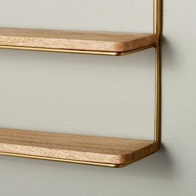 Add stylish organization to your home with the 16-Inch Wood & Brass Double Wall Shelf from Hearth & Hand™ with Magnolia. Made with metal, this wall shelf comes with double wooden shelves for a mixed-material look. You can hang the brass-finish shelf in your living room, entryway or any other spot to display your collection of floral arrangements, photos and more.
