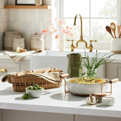 Bring your baked dishes directly from the oven to the table with the 3-Quart Oven-to-Table Fluted Stoneware Round Baking Dish with Cradle Carrier from Hearth & Hand™ with Magnolia. This round baking dish features a fluted exterior and comes with a gold-tone cradle carrier with side handles for easy carrying. The even-heating feature helps cook perfectly baked dishes. Made with stoneware, this fluted baking dish is oven-safe up to 500 degrees, and dishwasher safe for easy cleanup. Plus, you can use it to reheat food in the microwave or store in the freezer.