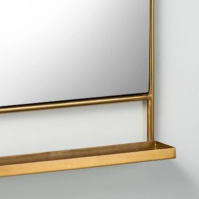 Add instant glam to your home with this Brass Finish Metal Framed Mirror with Shelf from Hearth & Hand™ with Magnolia. Designed in an arch shape with a built-in shelf, this metal-frame mirror showcases a brass finish that complements both your modern and traditional decor. Mount this arch-shape mirror on the wall of your entryway or living room alongside a wreath and use the built-in shelf to place a vase and other accessories.