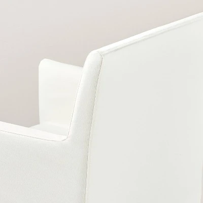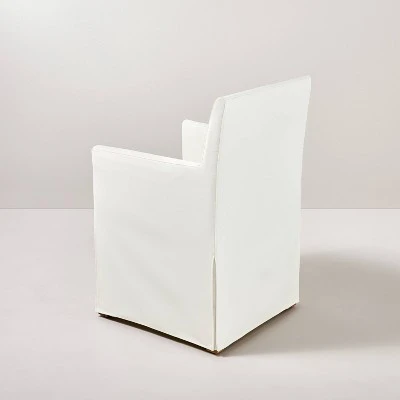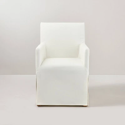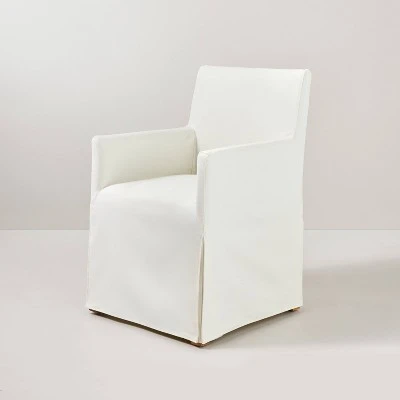 Elevate your dining room seating with this Canvas Slipcover Dining Chair from Hearth & Hand™ with Magnolia. This dining chair features a slipcover design with an elegant skirted bottom to hide the legs. Complete with a padded seat and an angled backrest with armrests, it offers a comfortable seat for meals and more. The solid canvas upholstery cover pairs easily with a range of decor styles and can be machine washed for easy care.
