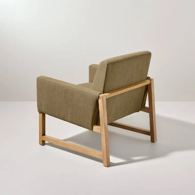 Bring unique seating solution to any space in your house with this Canvas Upholstered Accent Armchair from Hearth & Hand™ with Magnolia. Crafted from rubberwood material for better stability, the understated style and clean lines of this upholstered accent chair adds modern appeal to your space. Canvas upholstery gives the chair a comfortable surface, while the foam-filled attached cushion makes the chair extra inviting. Style this armchair in your living room or study area for comfortable style.