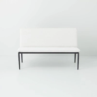 Lounge in comfort and style by sitting on this Cushioned Metal Outdoor Loveseat from Hearth & Hand™ with Magnolia. Designed with a metal frame, this sleek loveseat features a slatted back with slightly tapered legs and a round knob-like base. The removable cream cushion complements the black metal construction for a modern look while adding comfort to this metal-frame loveseat. Use this weather-resistant loveseat in your outdoor space, and add a round slatted table to complete your outdoor setup in elegant style.