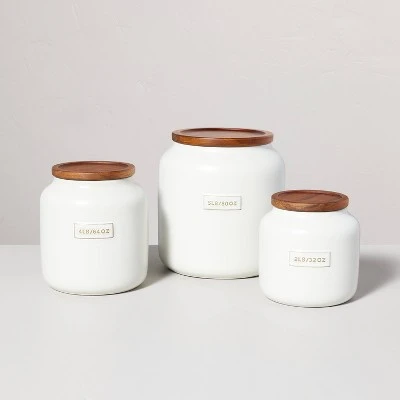 Conveniently store anything from cookies to crackers and beyond with this Dry Goods Stoneware Canister with Wood Lid from Hearth & Hand™ with Magnolia. This stoneware canister is designed with a wide-mouth lid for easily filling and retrieving of dried snacks. It features a matte cream finish with capacity units in pounds and ounces embossed on the front, and the wooden lid adds a touch of rustic style to your kitchen or pantry.