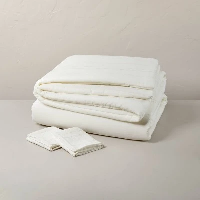 Refresh your bedroom’s look with the Fine Stripe Comforter Set from Hearth & Hand™ with Magnolia. This comforter set includes a soft-filled comforter with fine horizontal stripes in a light taupe shade on a cream background for a touch of tonal style. A matching pillow sham with a six-inch inner envelope completes the bedding set for a cohesive, neat look. Made from a soft, breathable fabric blend, this comforter and pillow sham set brings you year-round comfort, while its machine-washable design makes for easy care — simply add your choice of sheets and decorative pillows to give the decor of any bedroom a stylish makeover.