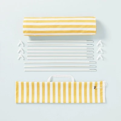 Keep your kiddo’s outdoor playtime fun and exciting with this Stargazing Play Tent from Hearth & Hand™ with Magnolia. Set on a fiberglass frame, this playhouse is designed as a play tent and showcases a white and yellow stripe pattern. Featuring a large entrance at the front with ties to give the option of leaving it open or closed, the stargazing tent offers them a soft spot for sitting comfort.