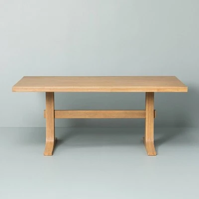 Create a farmhouse-inspired dining setting with this Wood Dining Table from Hearth & Hand™ with Magnolia. Set on a pedestal base, this brown dining table blends easily with your decor with its streamlined silhouette. This rectangle dining table provides enough space to create seating for six — just pair it with matching chairs to create a coordinated dining setting.