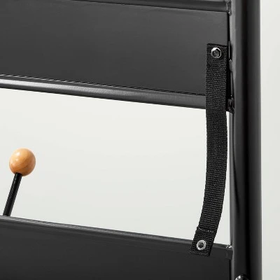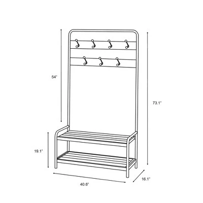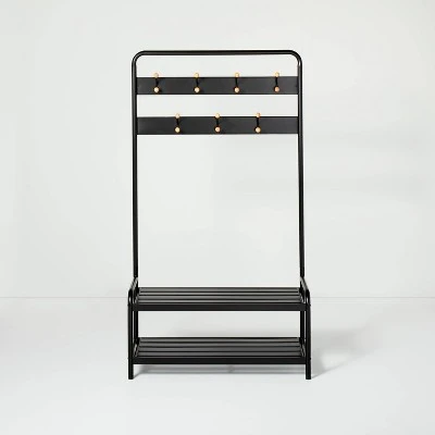 Organize your busy entryway with the Slat Metal Entryway Bench & Hall Tree from Hearth & Hand™ with Magnolia. Featuring a powder-coated black metal frame, this hall tree with a bench offers your visitors and family members a convenient place to sit as well as a place to leave their coats, hats and shoes. The 73-inch-tall entryway organizer has seven hooks at the two horizontal slats at the top for hanging scarves, keys and other accessories. Additionally, the lower bench with arms provides a comfy place to sit while taking off shoes and doubles as a convenient drop spot for large bags and bulky items, and the bottom slatted shelf can be used to arrange footwear neatly.