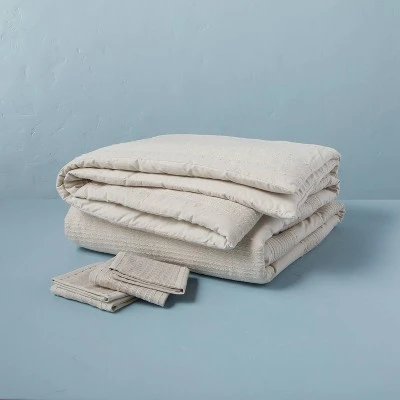 Add a sumptuous sense of style and comfort to your master suite or guest bedroom with the Slub Center Stripe Comforter Set from Hearth & Hand™ with Magnolia. This solid-colored bedding set includes a soft filled comforter designed with lumpy textured stripes on a neutral-hued backdrop to lend eye-catching appeal to your sleeping nook. Also included are matching pillow sham(s) to complete your bedding ensemble in cohesive style. Made of 100% cotton fabric, this comforter set offers a chic update to your bedroom decor and is machine washable for easy upkeep.