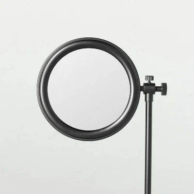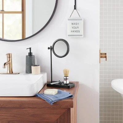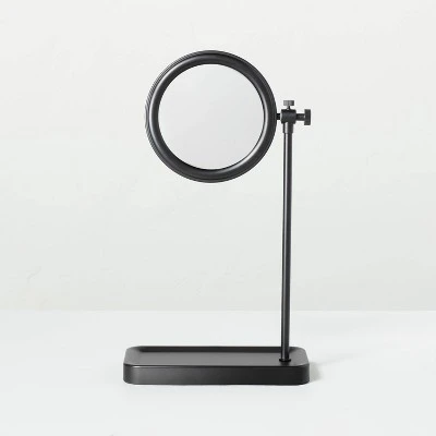 Add style and functionality to your bath space with this Vanity Hand Mirror with Tray Base from Hearth & Hand™ with Magnolia. Designed with a metal frame in a powder-coated matte finish, this vanity mirror stands on a rod set on a tray base to help keep your accessories within reach. The round mirror comes with a convenient swivel feature to make it easy to move while applying makeup or during your morning skin regime. Place it on the countertop alongside sink and hang a round metal-frame mirror on the wall for a coordinated spa look in your home bath.