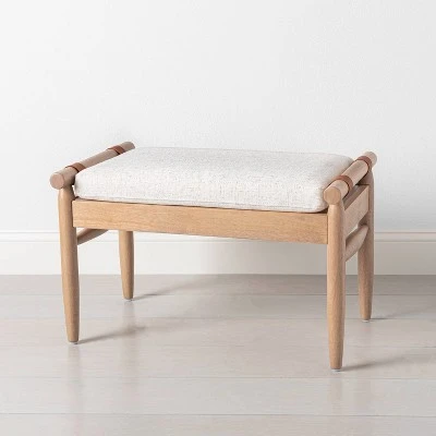 Treat your feet to a soothing resting place while updating your decor with the elegantly understated style of the Upholstered Natural Wood Ottoman from Hearth & Hand™ with Magnolia. With a sturdy hardwood frame in a light natural finish, this ottoman boasts a clean-line silhouette that’s beautifully accented by a fabric-upholstered cushion in a neutral shade. The ottoman supports up to 225 pounds, making it equally ideal as an extra seating option when guests drop in. Give it a home in front of your couch or an accent chair to kick up your feet after a long day, or keep it in the entryway for a quick seat you’re sure to appreciate.
