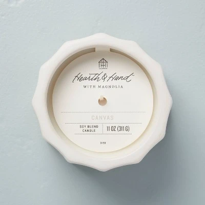 Add aromatic appeal to your home decor with the Wide Fluted Speckled Ceramic Canvas Jar Candle from Hearth & Hand™ with Magnolia. This tonal cream jar candle features a wide fluted design with speckled hues for a graceful look you’ll love adding to your indoor or sheltered outdoor space. The jar candle has a mix of citrus and lemon scents to create a fresh ambiance that’s perfect for get-togethers, relaxing after a long day and more. Filled with paraffin and palm wax, this ceramic jar candle has a burn time of around 50 hours.
