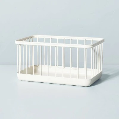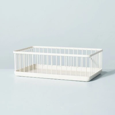The Metal Wire Storage Basket from Hearth & Handâ„¢ with Magnolia brings handy organization to your space and keeps things neat and accessible. This metal basket has an open-wired construction that is great for keeping tabs on what’s inside and lets you remove and replace items easily, while its solid bottom provides a secure base for snack packs, craft supplies and other household items. It’s finished in a matte cream hue that will look great and go with any type of home decor. The multipurpose storage basket can be used in any room of your home to declutter your space by keeping magazines, books and more nicely arranged.
