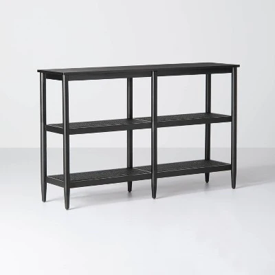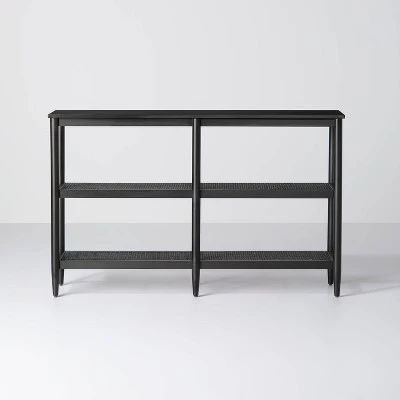 Organize your favorite books and other items in style with this Wood & Cane Short Console Bookshelf from Hearth & Hand™ with Magnolia. Crafted from solid wood in a black finish for a stylish look, this console bookshelf comes with open cane shelves, making it easy to fit your favorite books and possessions while adding a functional and decorative touch to your room. The spacious tabletop provides the perfect place to showcase potted plants, collected curios or framed photos — making it the perfect piece for any area of your home.