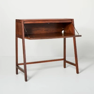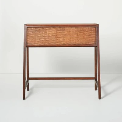 Doubling as a display console and workstation, this Wood & Cane Transitional Secretary Desk from Hearth & Hand™ with Magnolia is perfect to add style and function to your home. Featuring a wooden frame in a warm dark brown finish, this space-saving desk has a smooth tabletop for display and a front panel that’s accented with a beautifully woven cane design. The hinged panel flips down to create a spacious work surface with ample room for all your desk necessities like your laptop and much more. You may flip the panel back up once you’re done working to keep your clutter contained and out of sight. Plus, it has a cord management system so you can keep all of your cords and cables neatly organized.