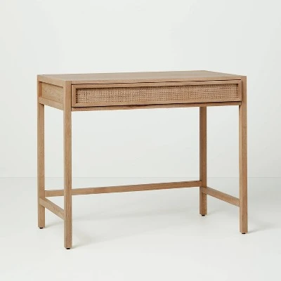 Refresh your reading nook or home office in sleek style with this Wood and Cane Transitional Writing Desk from Hearth & Hand™ with Magnolia. Crafted from wood, this rectangle writing desk has a natural finish to easily integrate into your existing decor style. Designed with a built-in drawer accented with decorative lattice, this writing desk offers ample space for your office supplies, lamp and more. Simply place this desk along the wall with a coordinating wooden chair to spruce up the look of your space.